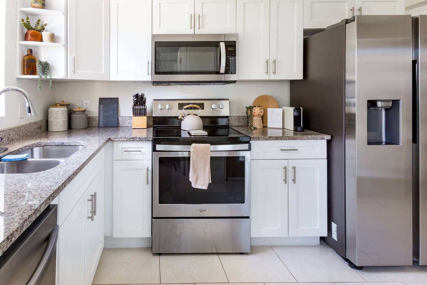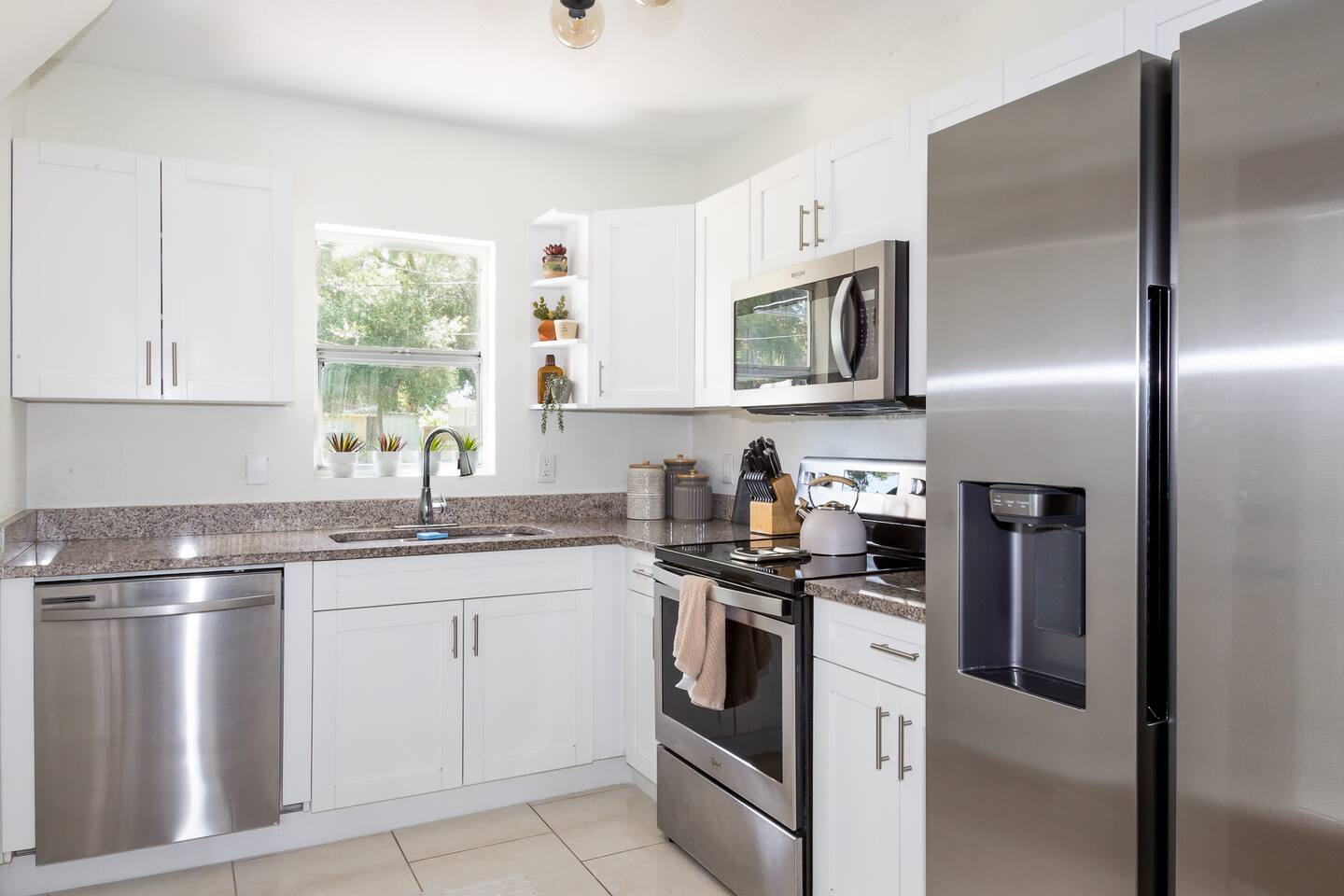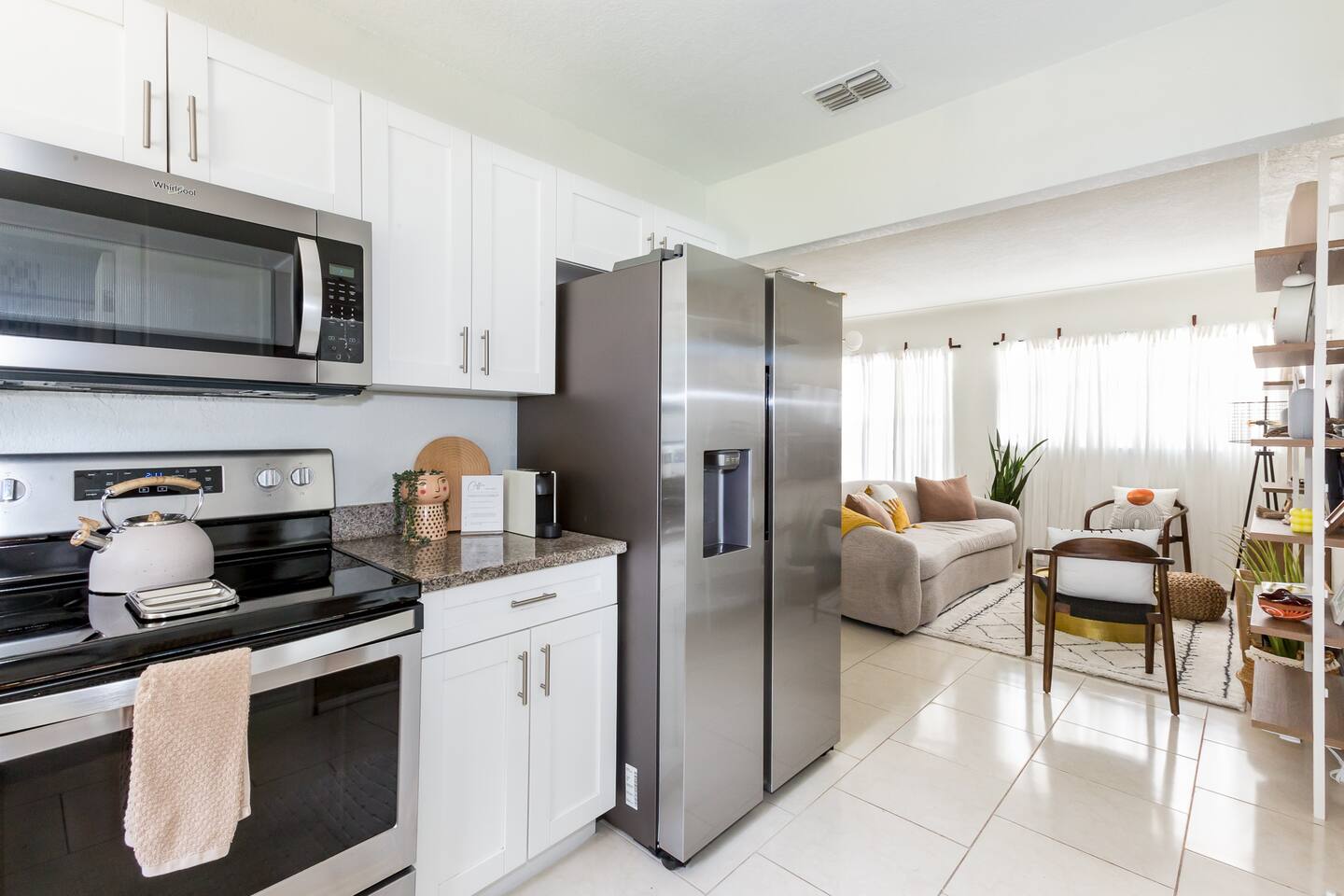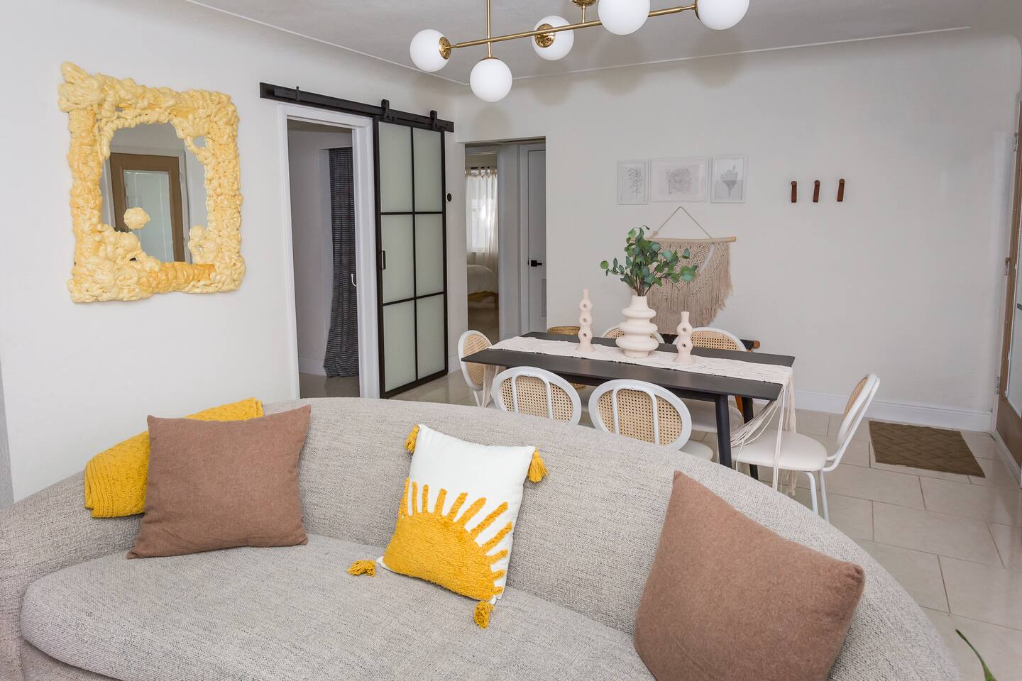Sol House: Radiance is a 3-bedroom, 2-bath retreat where mid-century modern design meets soulful comfort. Sunlight fills the open living and dining space, styled with warm neutrals, vibrant accents, and retro charm. Sink into the plush sofa, unwind with a Smart TV, or gather for meals made in the fully stocked kitchen—complete with a dual coffee/espresso maker to start your mornings with intention. Bedrooms: Primary Suite: Queen bed, soft linens, serene ambiance Bedroom 2: Queen bed, modern flair, calming vibe Bedroom 3: Two twin beds, perfect for kids or friends Each room is designed for rest and renewal, with luxury linens, thoughtful touches, and inviting energy. Outdoor Oasis: Step into your private zen garden under a majestic oak tree, surrounded by tropical plants, agave, and peaceful seating nooks. Sip coffee, share cocktails, or bask in the Florida sun—your sanctuary awaits. Amenities: High-speed Wi-Fi Smart TV + streaming Central A/C Washer/Dryer Free on-site parking Luxury linens, towels, toiletries Fully stocked kitchen Keyless self-check-in Location: 15 min to downtown St. Pete (restaurants, shops, museums) 15 min to Gulf beaches Nearby parks, golf, St. Pete Pier, and nightlife Whether it’s a family getaway, romantic retreat, or friends’ weekend, Sol House: Radiance is where light, warmth, and renewal meet. Your escape starts here.