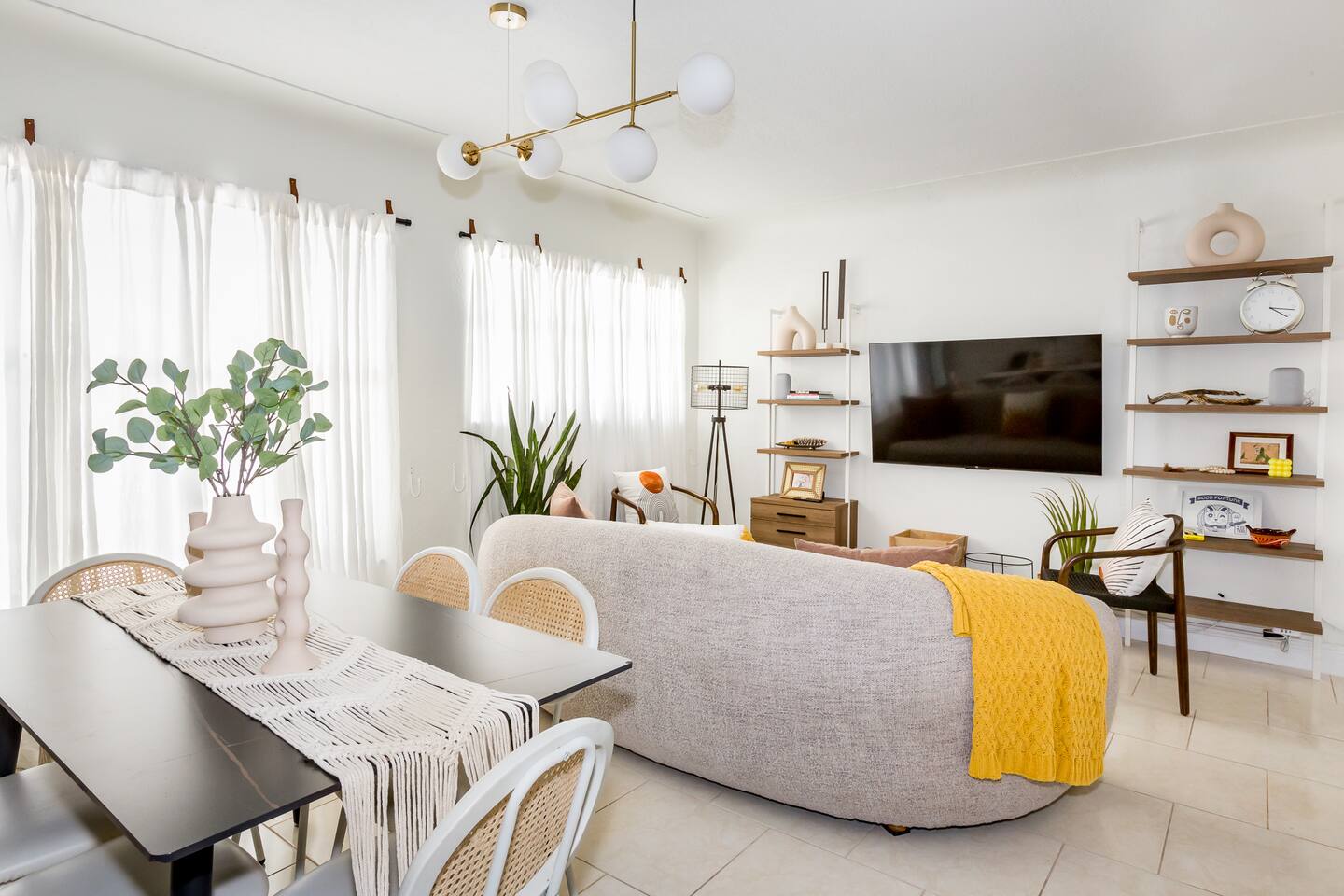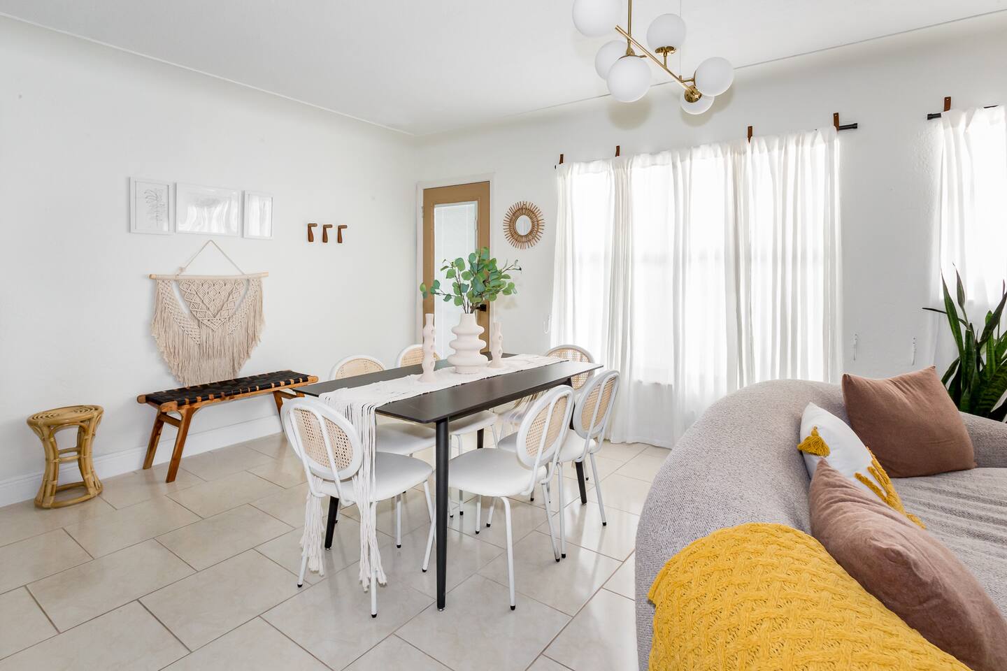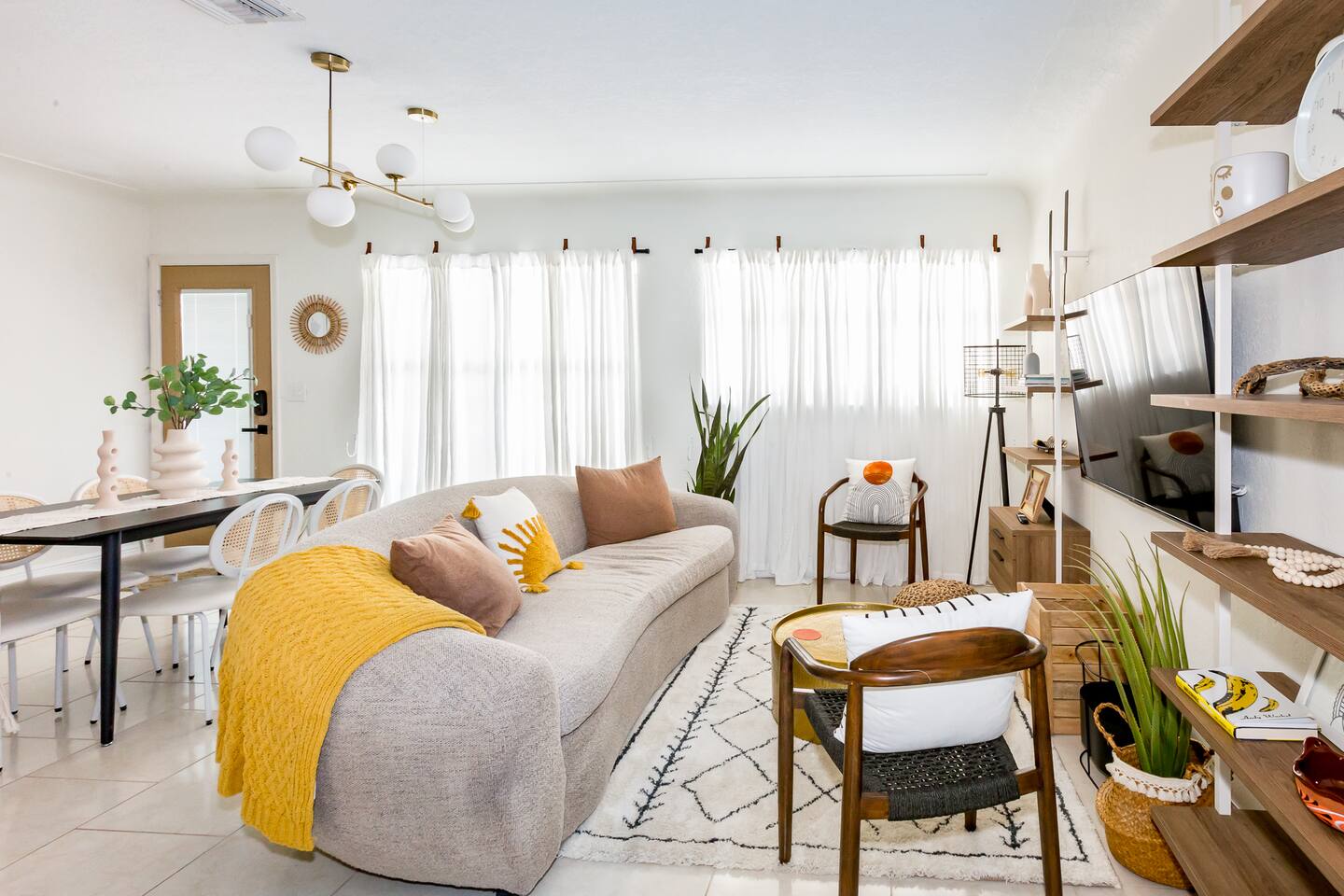 Escape to Sol House: Radiance. A serene, mid-century modern bungalow just minutes from St. Pete’s beaches and downtown. Thoughtfully designed for comfort and style, this peaceful retreat offers the perfect blend of relaxation and access to top dining, shopping, and coastal adventures. Enjoy a private backyard oasis, cozy living spaces, and curated details throughout. Whether you’re here to unwind or explore, Sol House: Radiance is your sanctuary in the sun—where warmth, light, and renewal meet.